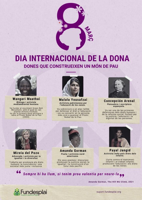 Amb motiu d’aquesta data, des del servei d’igualtat de gènere i diversitat de Suport Tercer Sector hem elaborat un cartell amb dones referents que han contribuït a promoure la cultura de la pau i la justícia social.